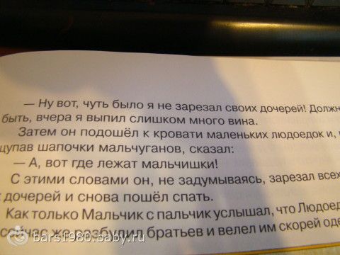 а у нас про мальчика-с-пальчика бабка капусту рубила и отрубила себе ПАЛЕЦ!!! завернула его в платочек и положила на окно! о как! первый раз прочла, тоже в шоке была, но тут… выше всяких «похвал»!