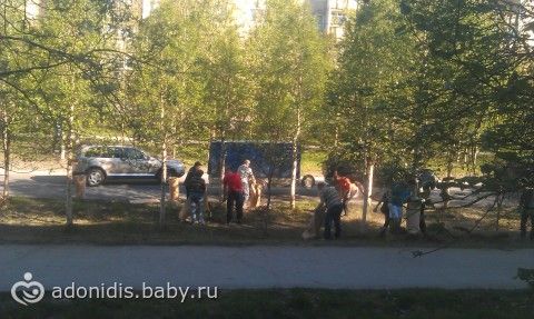 Встаем сегодня с Владой кашу кушать, смотрю в окно а там субботник народ затеял.в субботу в 9 утра