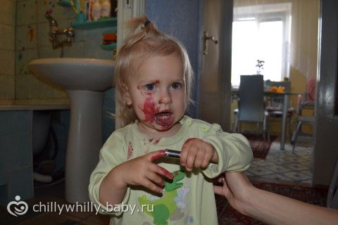 Когда я крашусь, то обязательно в ручонки надо взять какую-нибудь кисточку, карандашик или спонжик и делать вид, что тоже наводит «марафет».