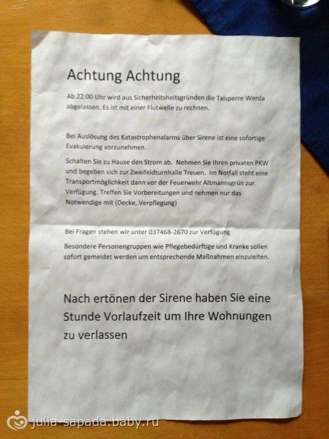Благодаря затяжным дождям в Германии, в частности в моём регионе земли Саксония, увеличился уровень воды в реках и озёрах, что привело к потопу близлежащих территорий.На сегодняшний день в моём регионе многие дороги перекрыты, школы и сады закрыты, люди из своих домов эвакуированы в безопасное место.Особое предупреждение для населения быть готовыми для эвакуации...