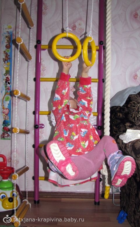 повесили кольца на спорт.комплекс, Маша сразу стала на них висеть, да еще делать всякие акробатические упражнения.