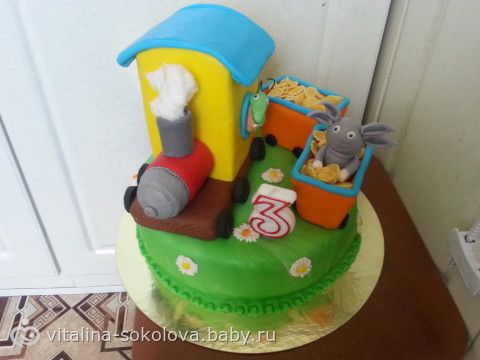 А тортик очень вкусный! Сыну понравился. Сначала съел все колеса у паровоза и вагонов. Потом долго пересыпал хлопья из вагонов и катал в них Лунтика и Кузю. И только потом разрешил отрезать по кусочку.