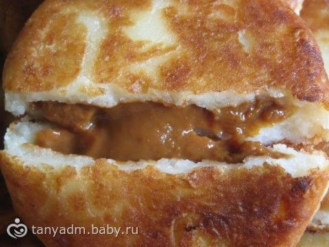 Мешаем тесто, лепим маленький оладушек, в серединку кладем ложечку (чайную) сгущенки, а сверху накрываем вторым оладушком, залепляем края. Обжаривае с двух сторон на масле подсолнечном и готово!!! Вкуснотища!!!!