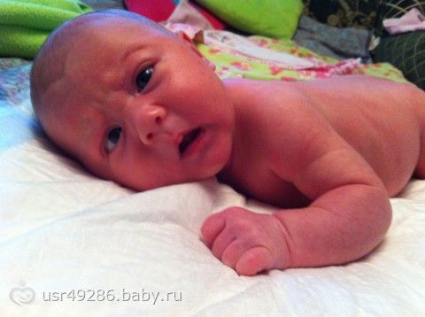 На животик выкладываем, голову поднимает, переворачивает, но еще очень неуклюже, но стараеться пыхтит). на днях пойдем мобиль и коврик купим чтоб развлекать не только погремухами)