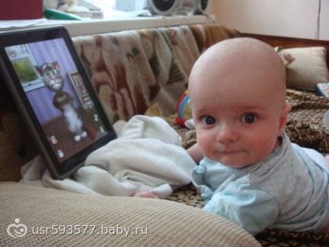 Это Кот Том, игрушка которая за тобой все попторяет, если его стукнуть он шипит и царапается, а если градить то мурчит. Вот мелкий с ним и общается