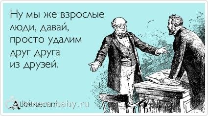 Если кого-то давно терзают смутные сомнения, не удалить ли меня из подружек, сделайте это сейчас, не ждите, когда я напишу очередную гадость, а потом буду спрашивать «А чего это ты меня удалила???» Ато мне недавно рассказали про мою «грубую манеру общения и чрезмерный сарказм, особенно там, где ему и вовсе не место»… Вот так. А я думала, что я добрая и пушистая))))))
