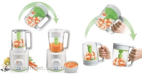 Это устройство «2-в-1» позволяет готовить на пару и измельчать пищу в одном контейнере.Технология: вы заливаете воду, кладете в контейнер продукты, нажимаете кнопку – и они начинают вариться на пару. После этого достаточно просто перевернуть контейнер вверх дном и повернуть ручку в другую сторону, чтобы уже сваренные продукты измельчились.