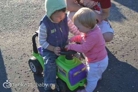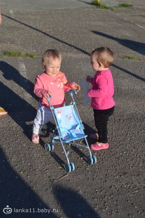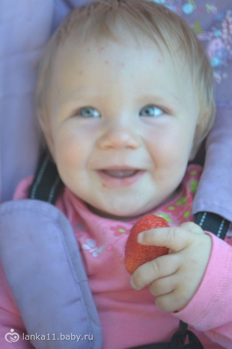 Я беру с собой на прогулку целый пакет игрух, но в итоге в них играют другие детки) Любят они чужие игрушки, даже если отличаются только цветом))) Никитка так клубничку кушает, даже самой захотелось)