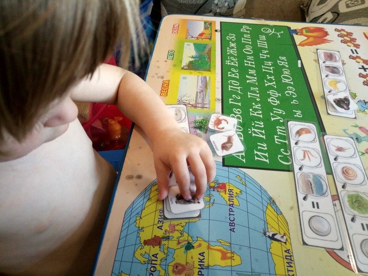 И предлагаю ребенку 4 карточки-ответа. Если она выбирает неверную карточку, например, лошадь, мы сравниваем то, что нарисовано в загадке и то, что есть у лошади. И я дую контрольную подсказку — это животное хрюкает, хрю-хрю.