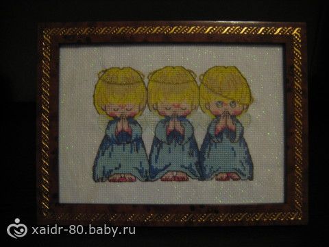 Никогда не вышивала крестиком)))) Но у меня свекровь этим делом ОЧЕНЬ увлекается. И как-то придя в гости, она мне дает эту вышивку. Показала мне, рассказала чего да как и куда))))) Ну я и начала вышивать потихоньку))) Вообщем не знаю от этой вышивки или чего, но как только я закончила первого ангелочка вышивать, мы наконец-то увидели заветные 2 полосочки (2 года никак не получалось))))) Вышивку я не бросила, закончила, хоть и намучилась)))) Желаю и Вам удачи