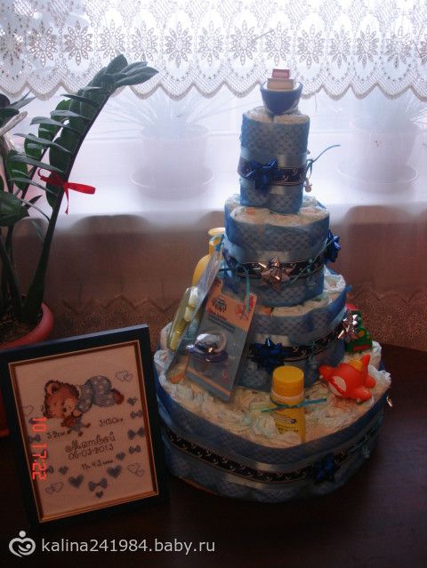 вот в марте сделала такой подарочек, золовке на рождение сыночка: метрика вышитая крестиком и торт из памперсов.