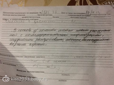 Эх девочки, душа снова наизнанку, зашла я туда и окунулась в воспоминания, как я там со своей деткой лежала, а потом неожиданный поворот, шок врача, мой шок… И его не стало… Каждый день об этом думаю, когда вижу детей, беременных или захожу сюда… Но вчерашнее подлило мне огня в душу… Сейчас прям сижу пишу и плачу, муж спит уже, ушла на кухню, не хочу чтоб он видел или слышал что я плачу… Короче отдали мне гистологию( наконец то) выловила врача своего, говорю скажите что нибудь, а она говорит ну тут все по делу и убежала. Я ничего не поняла… В диагнозе патологоанатом написал: нарушенная маточная беременность на сроке 5-6 недель. Как я понимаю эмбриональных. У меня так и было на тот момент, а акушерских почти 9… Но узи твердило что он уменьшился даже( как это???) размеры стали соответствовать 3 неделям… Короче у меня куда мыслей идиотских… А вдруг ошибка или еще что то… И что размеры узи почему то не совпадают с фактическими… Одно лишь отгоняет мысли это отсутствие сердцебиения, на платном тоже сказали что не бьется… Ладно что было того не вернуть. Вот то что патологоанатом обнаружила в соскобе если кто то что то понимает объясните мне, что это значит…