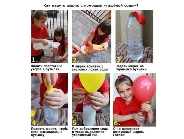 Вам понадобятся: — 1 ч.л. пищевой соды — сок лимона — 3 ст.л. уксуса — воздушный шарик — изолента — стакан и бутылка — воронка.
