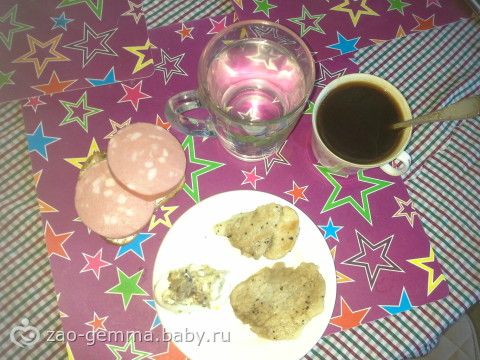 Завтрак: мяско на гриле, яичко фаршированное, бутер с президентом и колбаской, кофе «хзн».