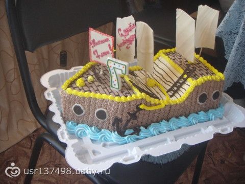 Ну и заказали тортик в виде корабля, но паруса меня огорчили, на фото, когда заказывали были намного красивей, а тут....., но ничего сыну понравился, а это главное