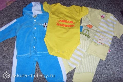 Легкий трикотажный костюмчик месяца на 2, я думаю. Бархатный спортивный костюм, очень приятный к телу, думаю, к осени как раз будет, и бодик (почему «Люблю папочку», а не «мамочку» не знаю). Еще подарила комбезик нежно-голубой с шапочкой в комплекте, но, кажется, что он нам уже маловат(( На фото нет, потому что закинула в стирку.