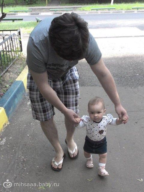 Мы уже очень хорошо стоим без поддержки и опоры, также может встать сама с «корточек» ни на что не опираясь, а вот ходить пока боится)))) Ручки сразу ко мне тянет, а если не дотягивается то решает доползти))) Всех и каждого использует как ходунки)))) Тут с любимым папой: