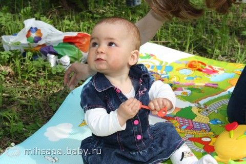 Очень любит людей, улыбается ВСЕМ прохожим и всем поднимает настроение, бабули с лавочек уже устали умиляться)))) Научилась делать утку (или ёжика — кому как больше нравится, правда сфоткать никак не получается), делает разные смешные и милые мордочки)))