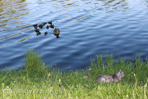 Тут же на подмогу новоиспеченной мамаше подоспел папашка-селезень, они увели детей в сторону, а сами вдвоем поплыли опять к коту и стали на него крякать уже вдвоем )))