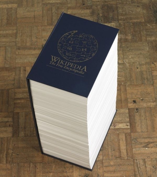 Всем известно, что количество статей в википедии превышает количество статей даже в самой полной энциклопедии, поэтому ее издание казалось нереальным. Дизайнер Роб Мэттьюс создал книгу, на 5000 страницах которой находятся самые посещаемые страницы английской википедии.
