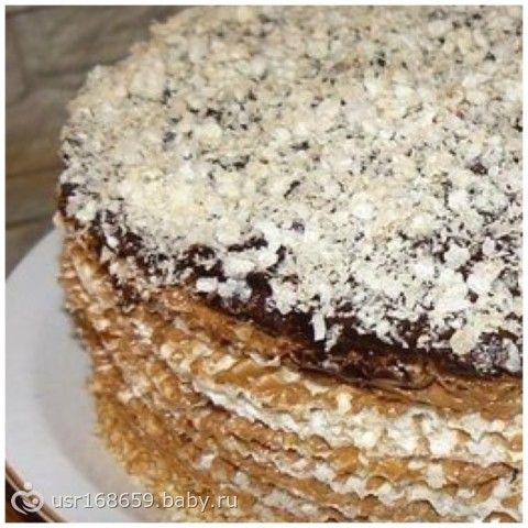 3. Верх торта смазать кремом или шоколадной глазурью, посыпать вафельной крошкой, полученной из одного коржа.