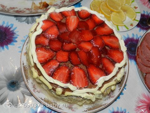Каждую лепешку обмакнуть в крем с двух сторон и выложить на большое блюдо или поднос в виде горки.Верхние лепешки кремом не покрывать.