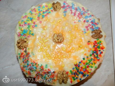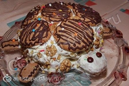 Украсить панцирь черепахи грецкими орехами и разноцветными посыпками и дать торту настояться.