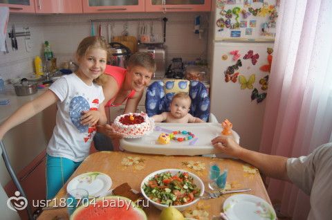 Вчера Альбертуньке стукнуло 6 месяцев!!! Отметили первый маленький юбилей ))) Приходили бабушка с дедушкой (мои) в гости. Задарили нам набор посуды детской, но нам из такой еще рано кушать убрали на потом чтоб не разбил. Подарили Альке его любимую игрушку — воздушный шарик! Он от них без ума. Вчера и сегодня тудым сюдым с ним ползает дергает облизывает подбрасывает. Я сделала салатик, поджарку из свининки, купили тортик и фруктики. Ну и выпили маленько за здоровье ))) Именинник сидел во главе стола (смотрите фотки ниже) и пока мы пытались запечатлеть его с тортиком он залез в него руками)))))) Вот счастья то было!!!