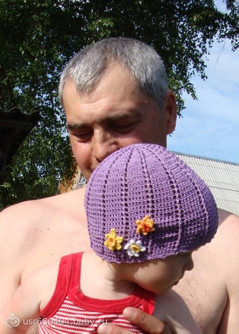 А это шапочка для Вари. Связаны нарциссы, но как-то я их пришила не очень — все лепестки позагибались сильно, но я это исправлю ) (у дедушки на руках)