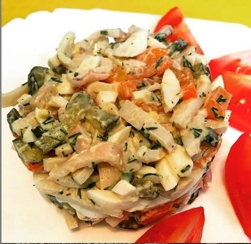Тушки кальмаров разморозить, почистить от внутренностей и плёнки, отварить в подсоленной воде (кинула в кипящую воду и поварила 3-4 минуты, не больше☝️), нарезала соломкой. Можно купить готовые замороженные кальмары соломкой или кольцами, я всегда за более бюджетный вариант ?? Морковь и яйца отварила и тоже нарезала соломкой. Огурцы маринованные без сахара или солёные нарезала аналогично. Всё смешала, добавила мелко рубленый укроп, соль и немного чёрного перца. Заправила йогуртом, объеденье