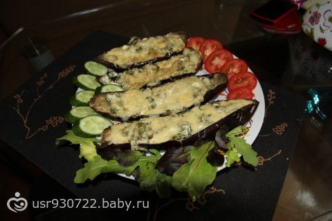 Это баклажанчики, Даю рецептик так, как мне давали: "баклажаны запекаем целиком, потом разрезаю на пополам, вынимаю мякоть, и мешаю ее с сыром фетой петрушкой и олив.маслом, все это снова начиняю в баклажан и посыпаю чуток сыром тертым. и на 15 минуток в духовку на 180 гр)"