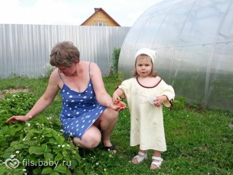 потом пошли на грядки))) Эни больше всего понравилась земляника..