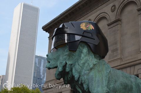 львы у входа в арт музей — в честь местной хоккейной команды-победителя их обрядили в в хоккейные шлемы с их эмблемой)))