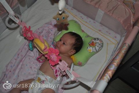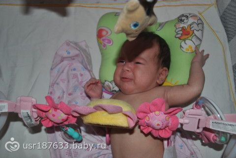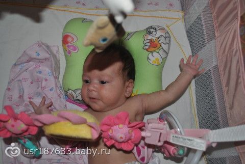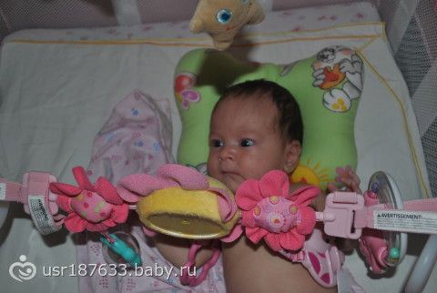 Красотуля моя очень любит все рассматривать. И уже пытается играть, бить по игрушкам. Но в момент съемки думала ее ненадолго отвлечь, а она моси стала делать) Не удалось мне покушать.