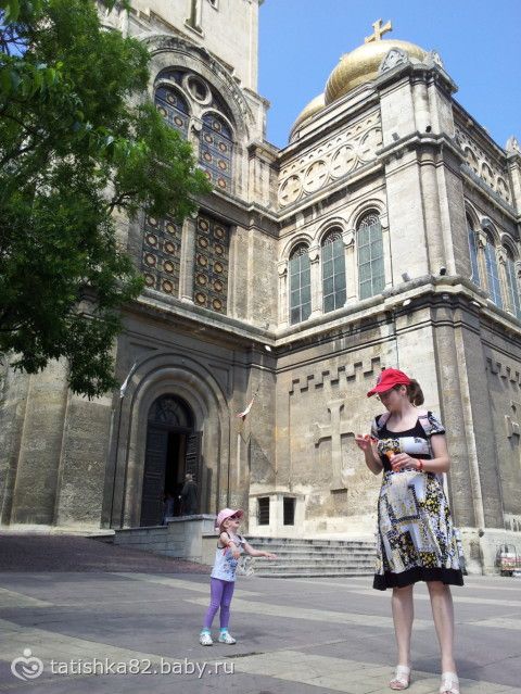 Договорились с таксистом что он нас в час заберет после того как мы нагуляемся.а представление в 10-30.оставил номер телеф.ну а мы все ж рванули на автобусе в варну.это еще 20 мин езды.в ТЦ.походили.поели.цены не чета москве… тот же ресторанный дворик но в 10раз дешевле.я хотела. найти кофтень на флисе с капюшоном.в итоге все у них дорого хотя нам сказали что должно быть обратно.обошли 2 ТЦ.надя уснула.не нашла.а что нашла-красиво но в курской фабрике запросто можно купить и в москве.вышли на улицу.я по ходу автобуса приметила 2 магаза детских.и таааам я купила что хотела: тройку за 39 лев.правда турция.но класный костюм.и пошли мы пехом дальше.дошли до собора самого крупного в болгарии: успенский собор-кафедральный собор успения богородицыс надей зашли вовнутрь.