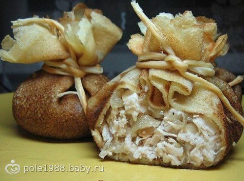 Приготовление: Развести в молоке яйца. Добавить растопленное сливочное масло, всыпать медленно муку, мешая. Добавить сахар и соль (по одной чайн. ложке). Жарить на горячей сковородке блины. Обжарить лук, добавить мелко порезанную курицу, посолить и немного прожарить. Залить сливками курицу (чтобы немного покрывали), потушить. На середину каждого блина выложить курицу. Собрать мешочками и перевязать сырной верёвочкой или перышком лука.