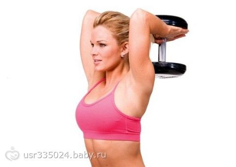 Возьмите двумя руками небольшую гантель, если таковой нету, то используйте обычную двухлитровую бутылку с водой, поднимите её и опустите за голову, затем вернитесь в исходное положение. Повторяйте столько раз, сколько сможете.