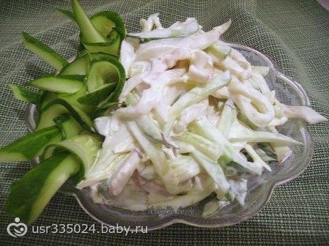 рецепт-огурец очищенный нарезанный полосками и кальмары заправлены сметаной 10 % можно йогутом без всего! а лучше соевым соусом!
