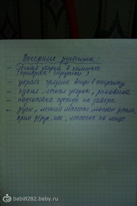 Вечером обычно, опять стирка, уборка игрушек, уложить всех спать, придумать меню на завтра.Убрать вещи.