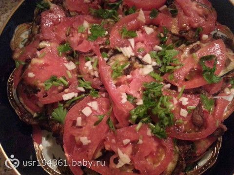 Берем баклажаны (на юге из зовут «синенькие»), режем кружочками и обжариваем в кляре, свежие помидорки режем кружочками, мелко рубим чесночок, любимую зелень меленько рвем или режем, кому как нравится. На блюдо первым слоем выкладываем обжаренные кружки баклажанов, сверху кружки помидорок, присыпаем нарубленным чесноком и зеленью, далее слои повторяем, а затем в холодильник минимум на 4 часа.