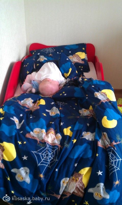 во взрослой кроватке спит, с утра вылезает и идет ко мне. Я досыпаю, а он рядышком играет. Приучался очень легко — ему так понравилась новая кровать, что он стал там сам засыпать