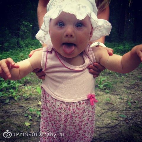 Очень общительная стала, всем улыбается, ко всем на руки идет)) На улице если видит ребенка, сразу начинает что то ему кричать на своем)) Недавно в магазине так с мальчиком перекрикивалась, прикольно блин)))