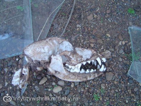 Вот череп собаки, почему то с перерубленным шейным позвонком