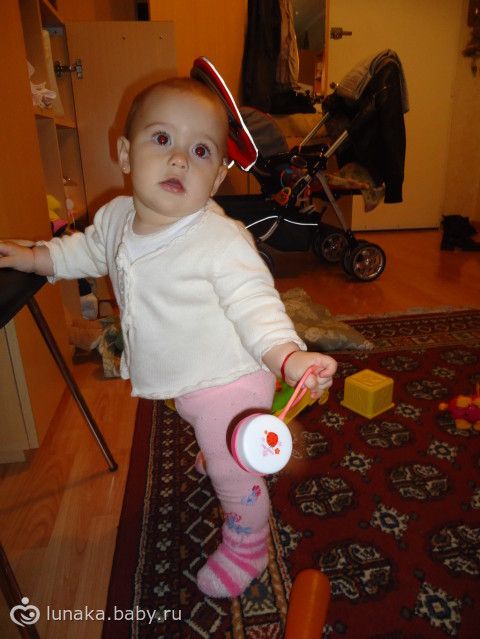 -стоим везгде где можем взяться, даже уже отпускаем руки и пытаемся держать равновесие, потом громко падаем на попу)))