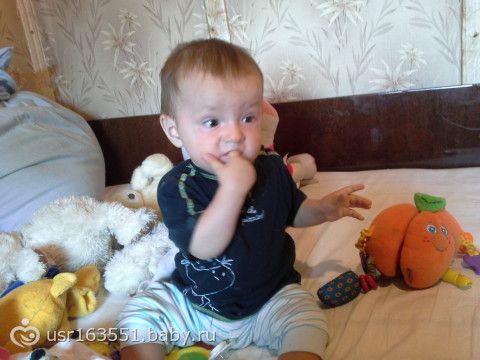 Как быстро летит время. Сыну уже 8 месяцев, а казалось бы только недавно страдали с коликами эээх. Наши достижения: пару раз сел сам когда лежал на спине, с бока еще не садится, когда за ручки держу ходит во всю и ему это похоже нравится. Еще у нас два зубика но они уже давно вылезли. А сегодня обнаружила что вылез еще и сверху один зубик (наконец-то). Когда лежит в кроватке цепляется за верх кровати и поднимается. Весим мы сейчас 8300 гр. и рост наш 73 см. Вот такие мы стали большие.