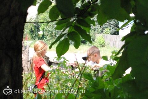 Но больше всего он кайфовал от того, что еда была повсюду!!! Абрикосы, малина, огурцы, помидоры и т.д.! Оказывается, его любимое блюдо — малина (обязательно грязная и только что сорванная!!!) А дома он такого интереса к ней не проявлял! Кстати, на фото ниже я вышла посмотреть как там дети и застала их «тырящими» эту самую малину, благо участок был наш!