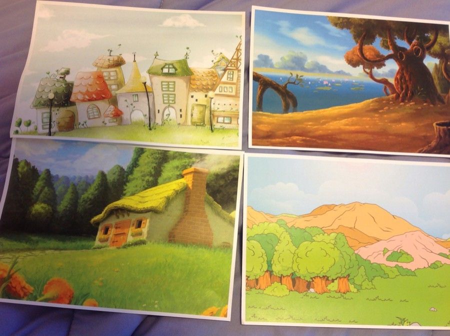 Еще распечатала картинки с мультяшными ландшафтами. Это для наклеечноо альбома. Будем клеить на эти рисунки зверей, цветочки, бабочки и все, что подойдет по теме.