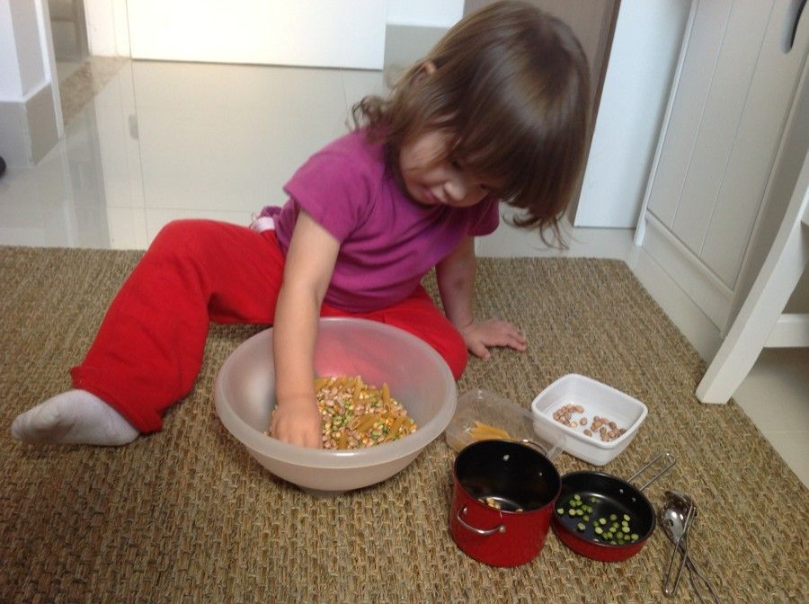 Это ее работа. Если случайно горох, например, попадал к фасоли, она его выуживала аккуратно и перекладывала в правильную емкость. Если падало что-то на пол, подбирала. Грязи вообще никакой не было после этой игры.