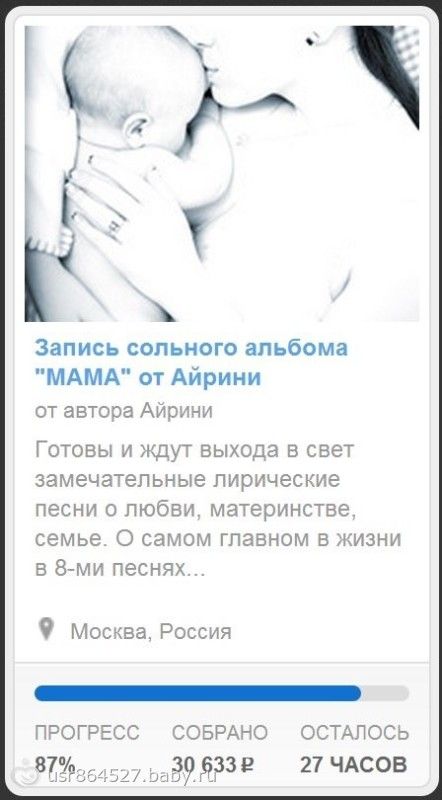 9 часов осталось, чтобы помочь проекту! Станьте соавтором! Замечательные лирические песни ждут выхода в свет! Простейшая регистрация на бумстартере, масса вариантов оплаты: с карты, с телефона, с терминала. В замен — шикарные подарки!!! Поможем альбому появиться на свет! Успейте поддержать проект до 11:30 по Москве