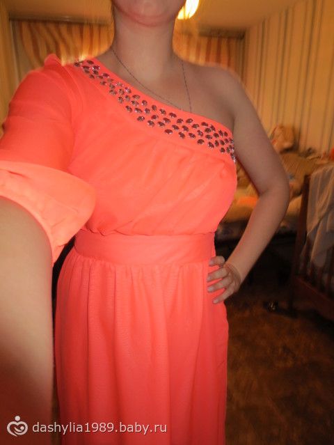 Выбрала коралл, пришло правда ярче, но оно писец прозрачное, по длине до пола только без каблука и пришло оно с рукавом и мне кажется сидит на мне как на барабане, но я еще в процессе похудения правда))))Вот оно на мне